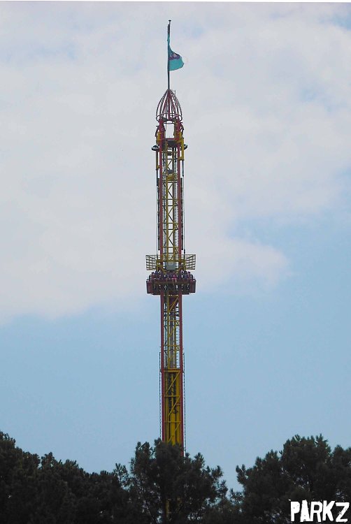 Free Fall is a decent sized drop tower, placed upon a hill that overlooks the park.