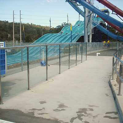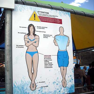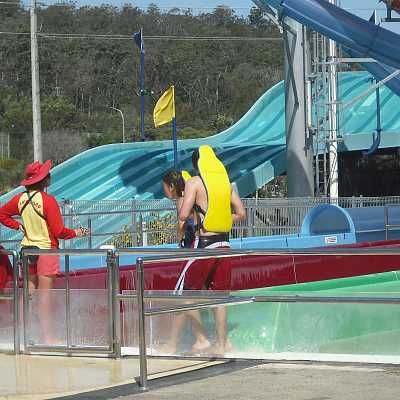 Riders on Aqualoop are now required to wear "aquapacks". They're made of foam, with hard plastic on the side that touches the side. Aparently they reduce the amount of times people stall out at the bottom of the slide, and protect your back from the slide suface.