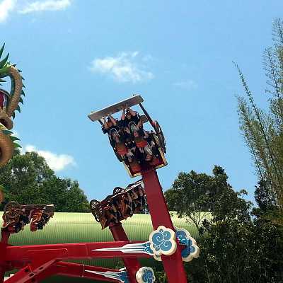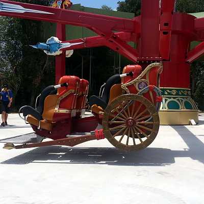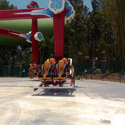 A front on view of the exposed vehicles. This shot was taken a the beginning of one of the infrequent "Soft Style" cycles. We think it might be that some guests might be put off by seeing the ride at full steam, and walk away not realising a more gentle cycle is availabe.