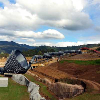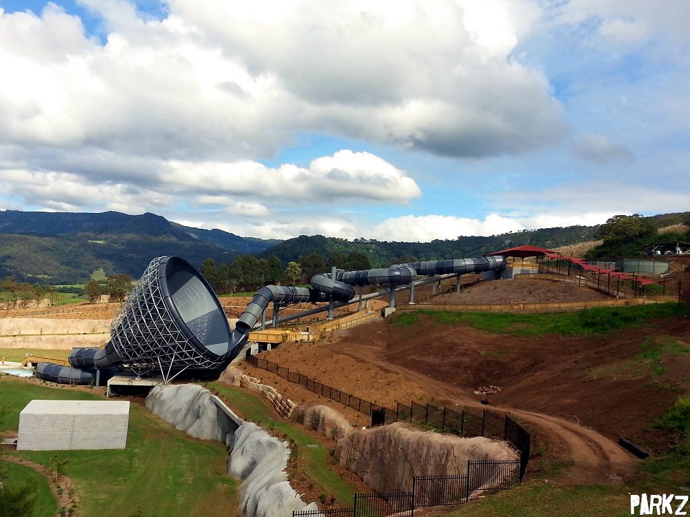 The slide starts out with a helter skelter of tight turns before dropping into a funnel, where riders rock up and down on the walls a few times before being flushed out one final spiral.