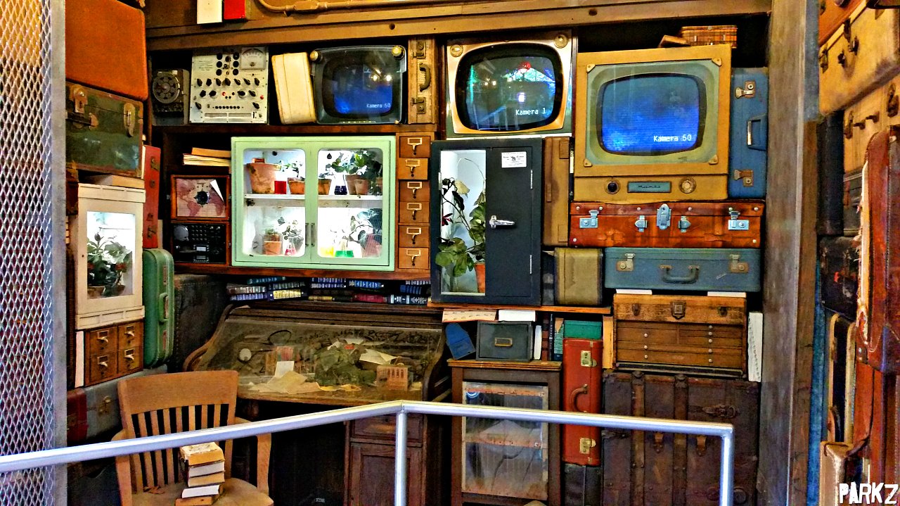 The second part of the queue passes through a workshop, where it seems the owner is deliberately trying to make the forest grow wild, and is watching the results on CCTV.