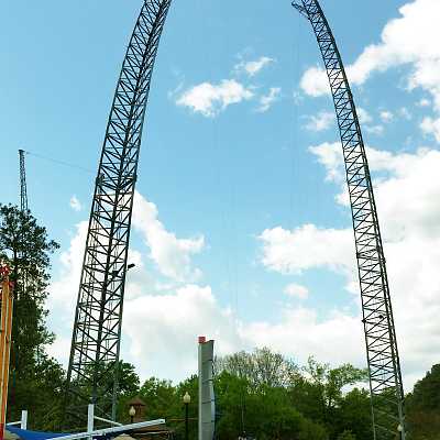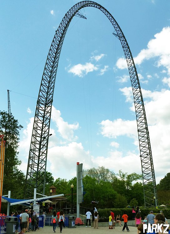 Like a giant swing, guests are harnessed up, suspended from a cable beneath the arch, towed back, then released, swinging back and forth.