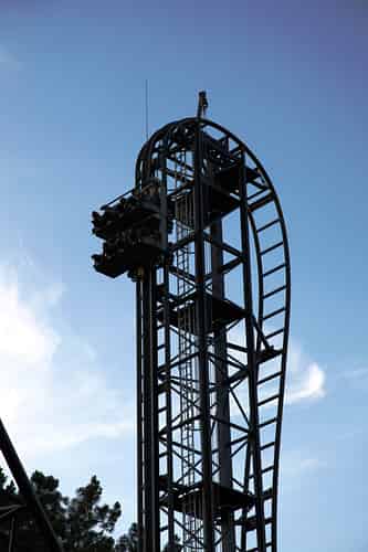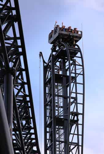 Riders head into the 100ยบ first drop – a steeper-than-vertical plummit.