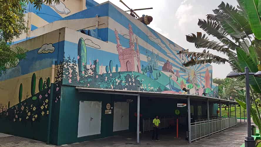 I for India is a "flying theatre", a newer generation ride type where guests are hoisted up in front of a large screen and watch aerial footage of Indian landmarks.