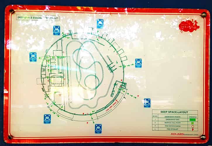 The fire exit plan reveals the layout to us. From the station are a series of s bends through a dark ride section themed around the pre launch sequence. From there is the main launch, followed by a turn, zero g roll, turn, hill, u turn, corkscrew, helix, hill, then one final turn into the brakes.
