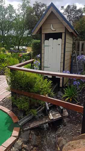 This hole involves hitting the ball into the thunder-box, where it is then flushed out the front.