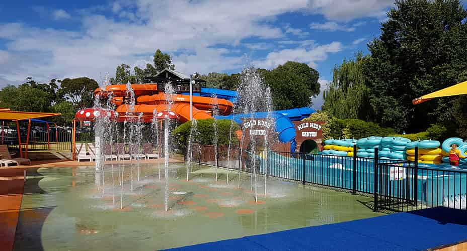 The Jumping Jets water play area is adjacent to the two raft slides.