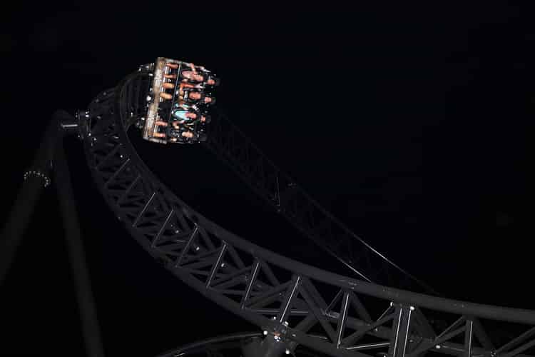 Riders head into the 100º first drop – a steeper-than-vertical plummit.