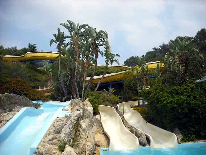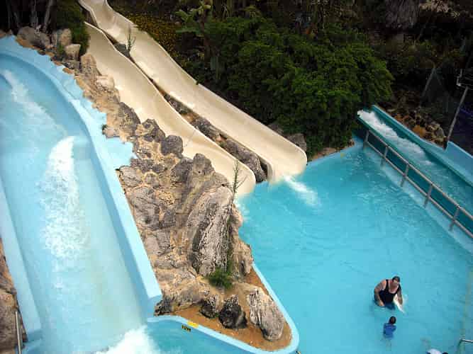 Both slides dump into a common splashdown pool.