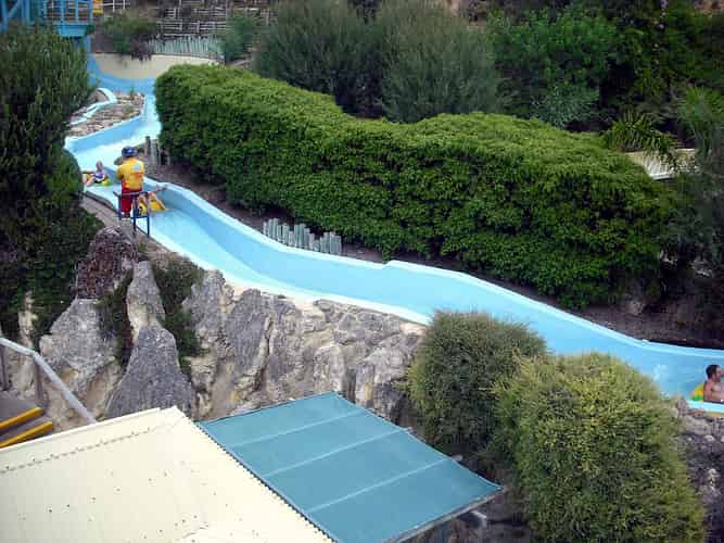 Rocky Rapids is a concrete tube chute style slide. Guests ride in rafts down waterfalls and through intermediate pools.