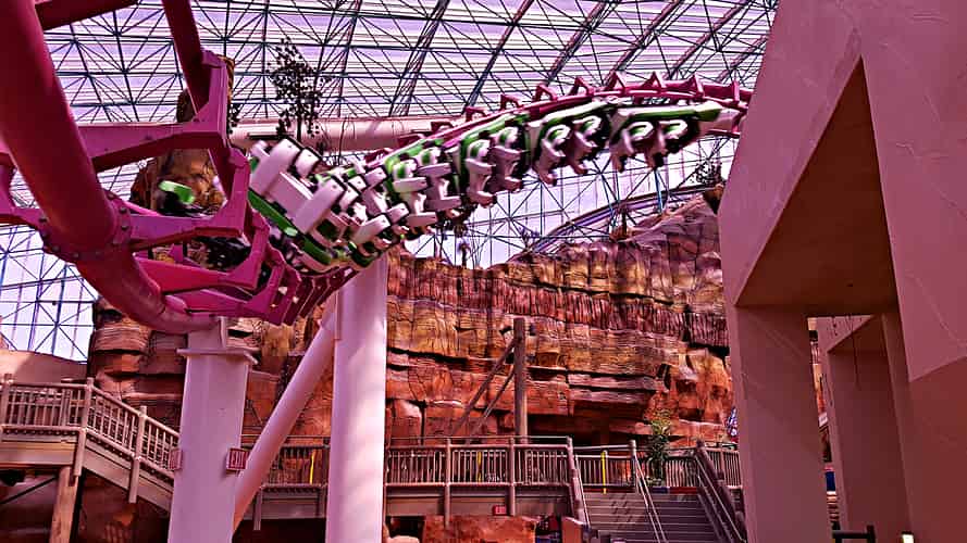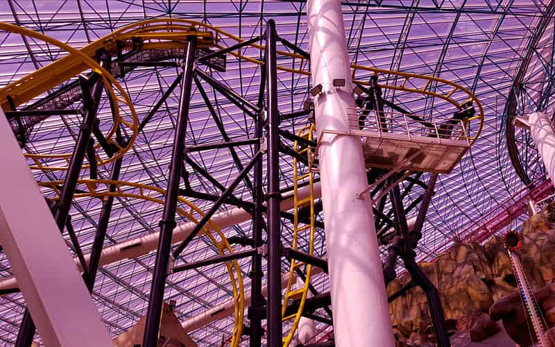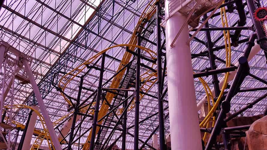 The bottom of the lift hill passes through one of many short tunnels along the course.
