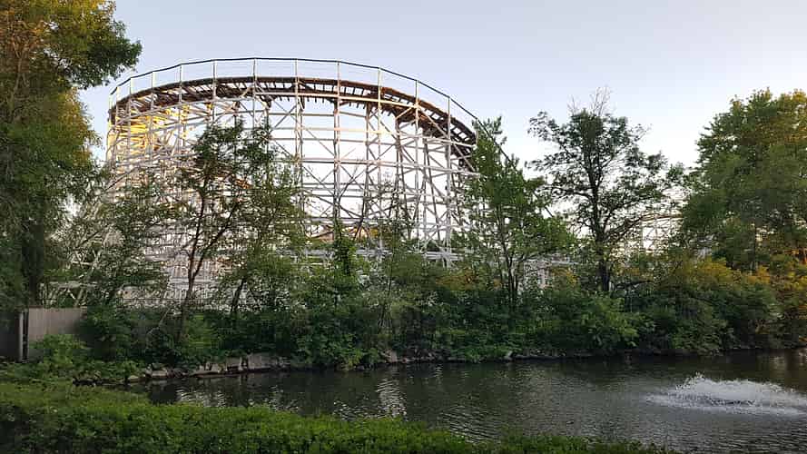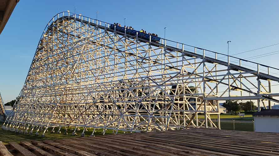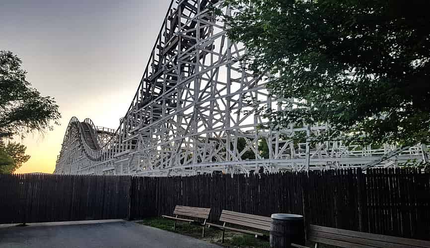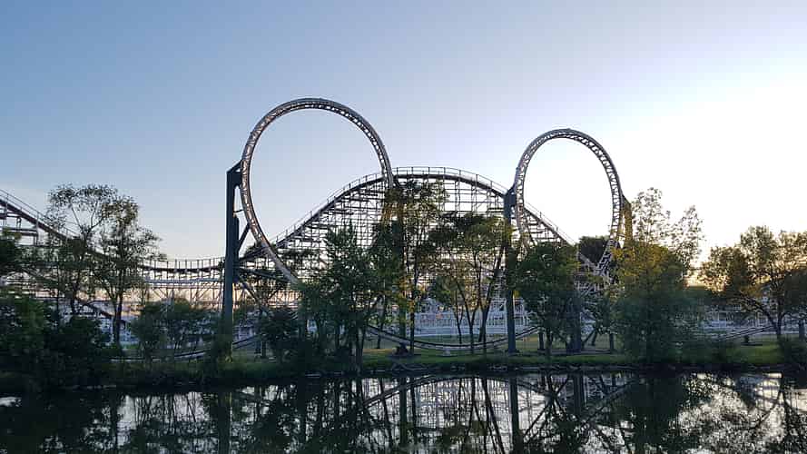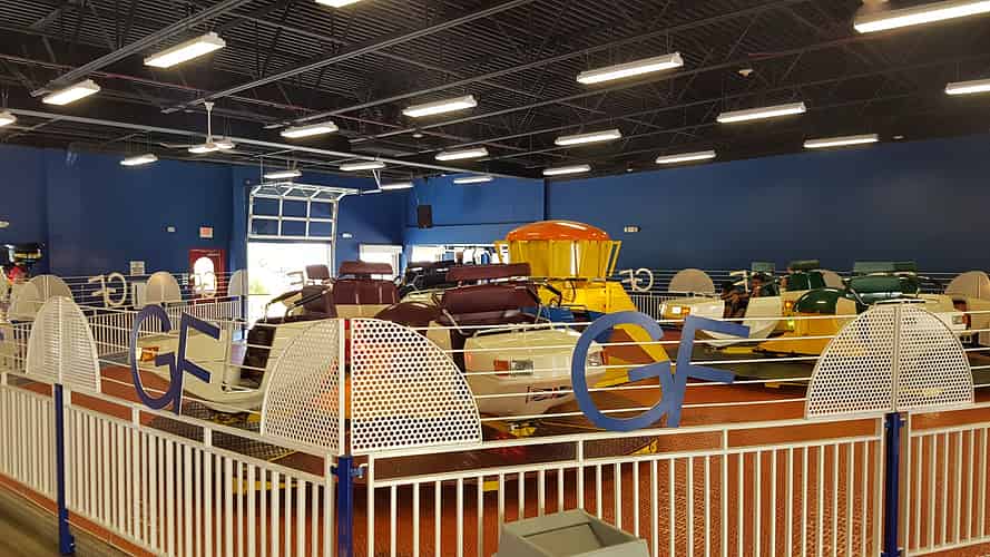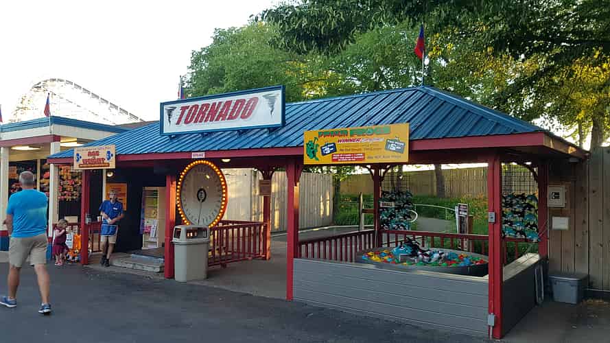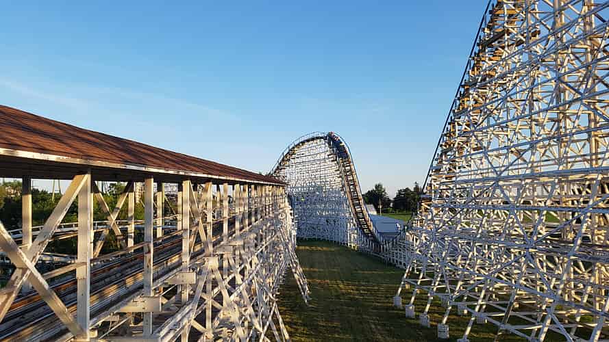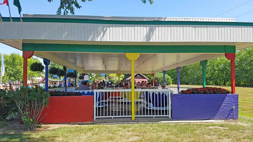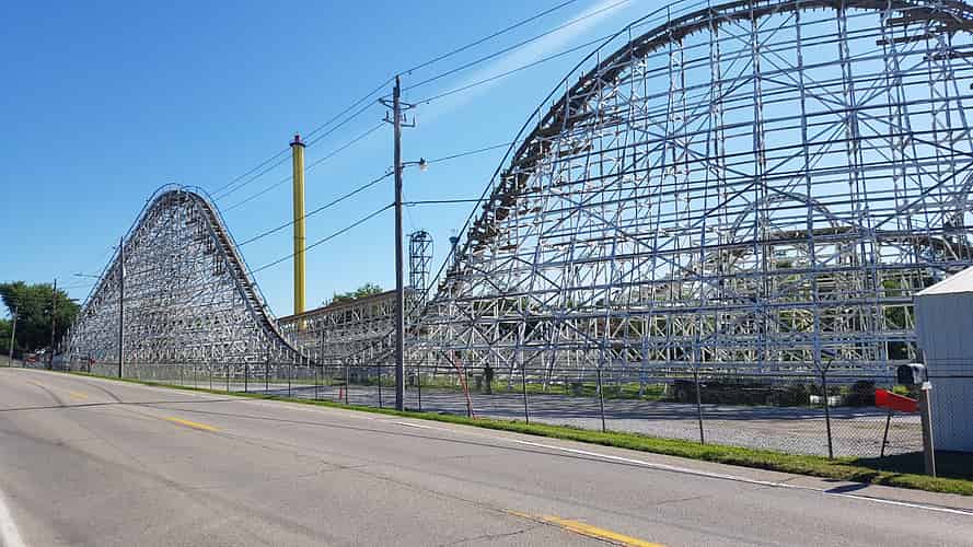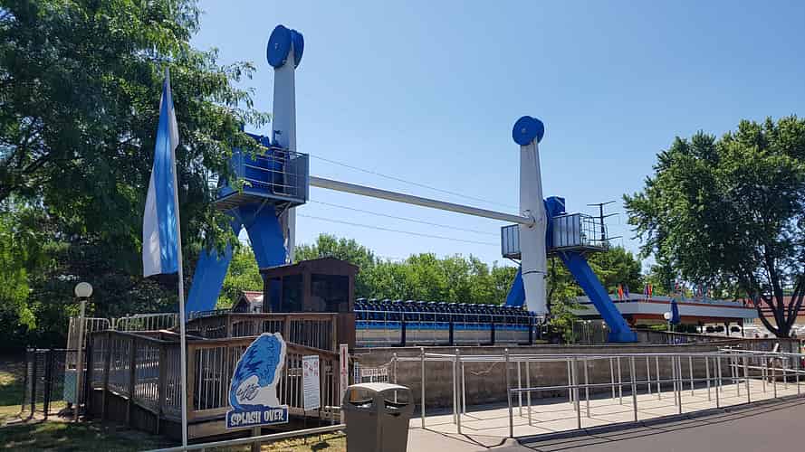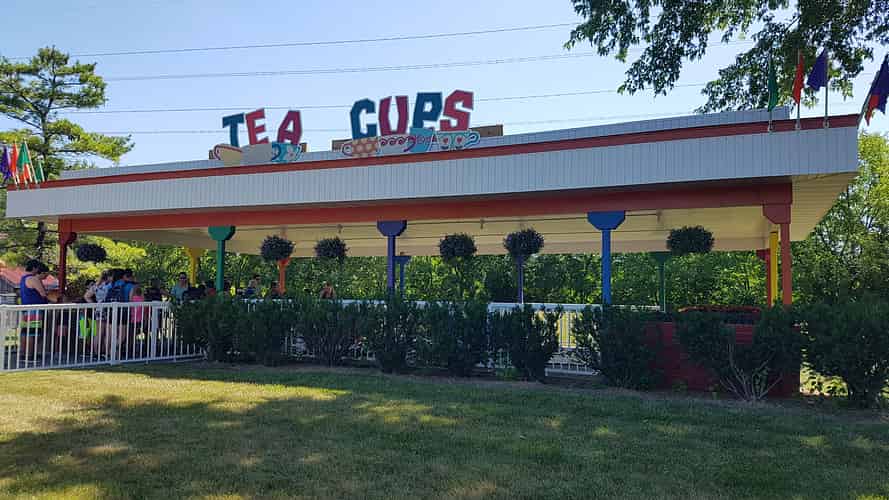 The Teacups are of the type where there are two turntables side by side, and the cups are able to unlock from one and lock onto the other, moving in a figure 8 motion.