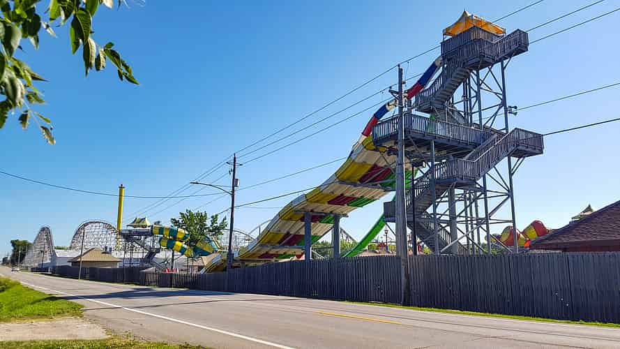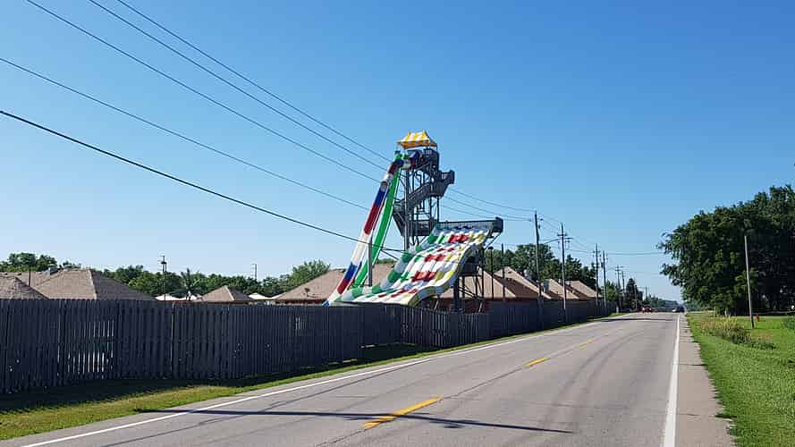 The final slide on Bermuda Quadrangle is a blue and green Cannon Bowl slide.