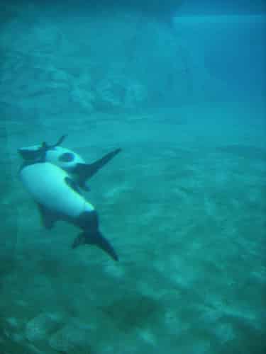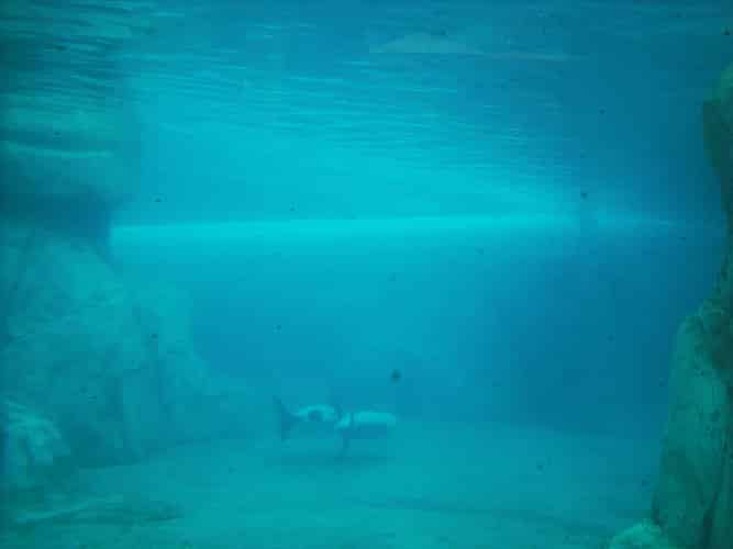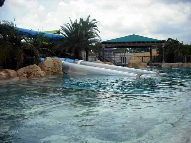 Riders then emerge into the sunlight and pass through transparent tubes through a Commersons Dolphin lagoon.