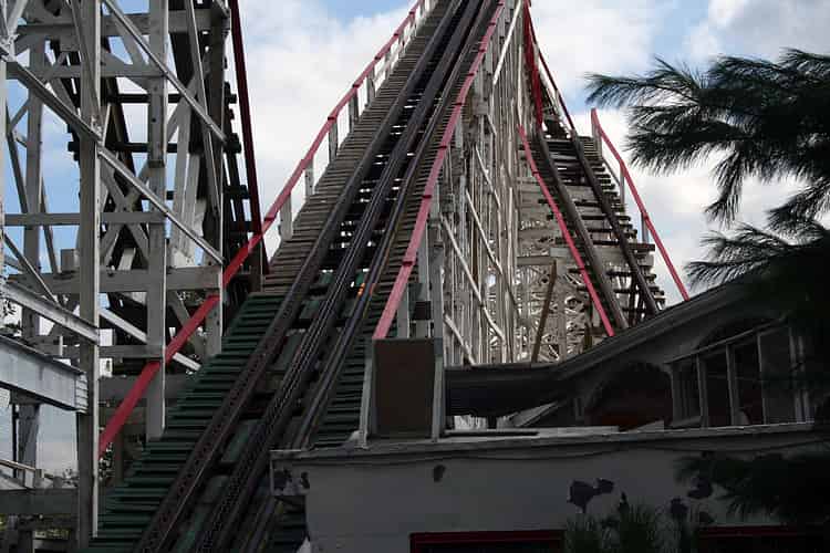 The iconic first drop was for many decades the steepest wooden roller coaster in the world.