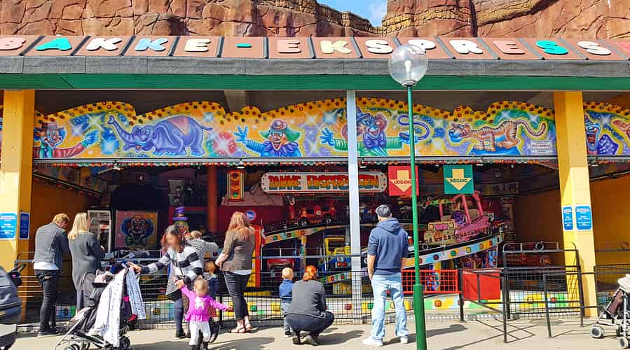 Bakkeekspressen is a car ride with interlinked vehicles. Spot the Flintstones car towards the front.