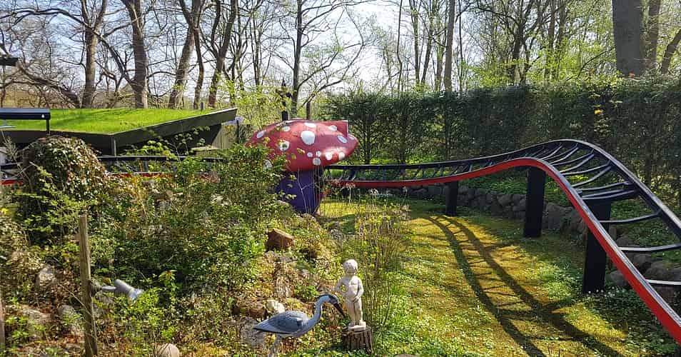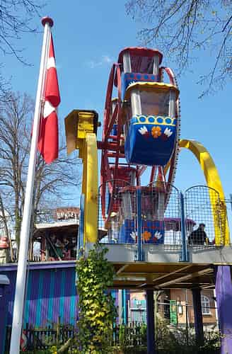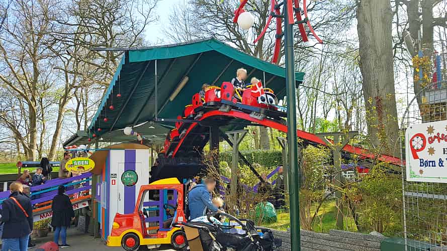 The first drop passes under the platform the Børnepariserhjulet ferris wheel.