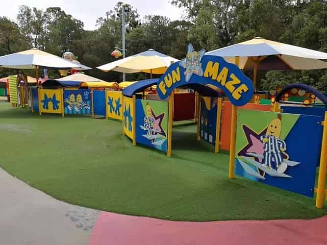 The Bananas in Pyjamas Fun Maze takes shape, using the same bright fence paneling as the rest of ABC Kids World.