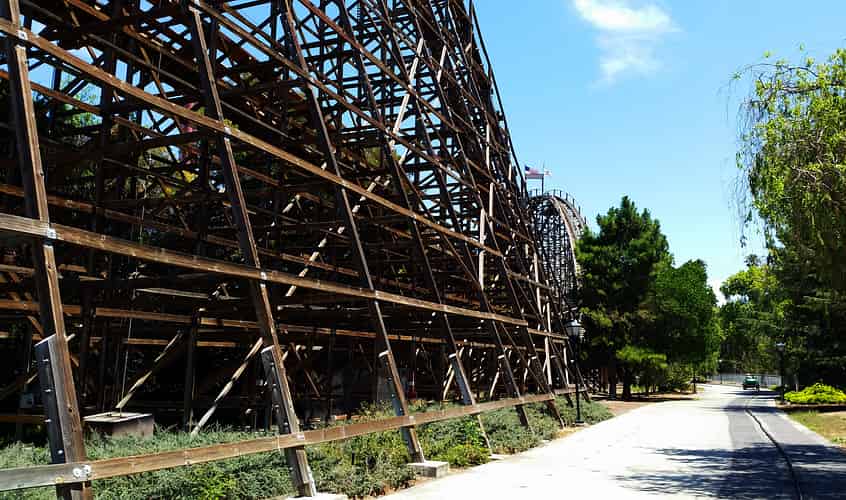 The track heads along through some shady gardens, and along the edge of the Grizzly and Demon roller coasters.