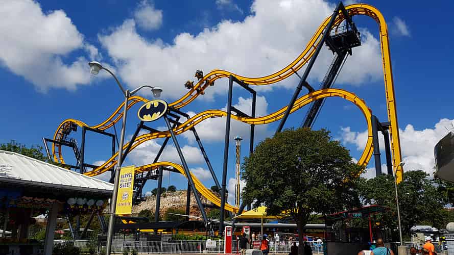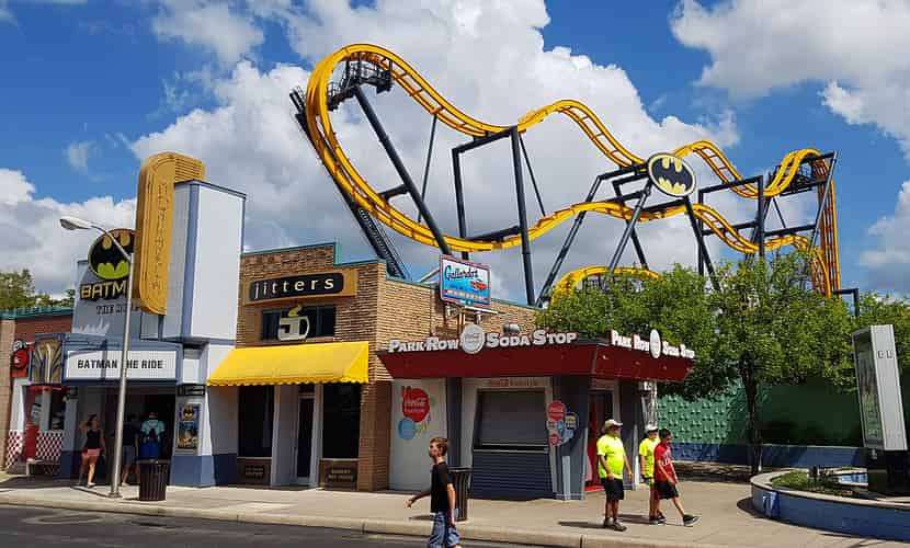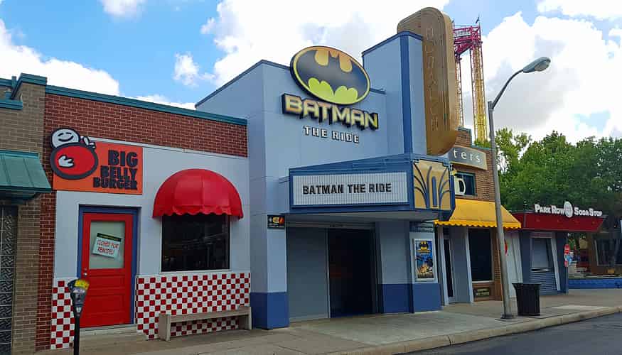 Batman: The Ride was the first installation of an S&S "Free Spin Coaster", which features seats that hang off the edge of the track and can perform somersault flips.