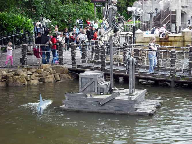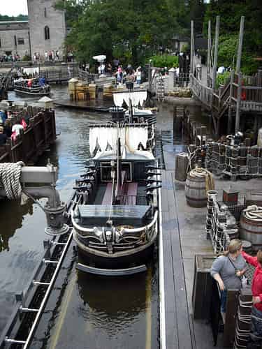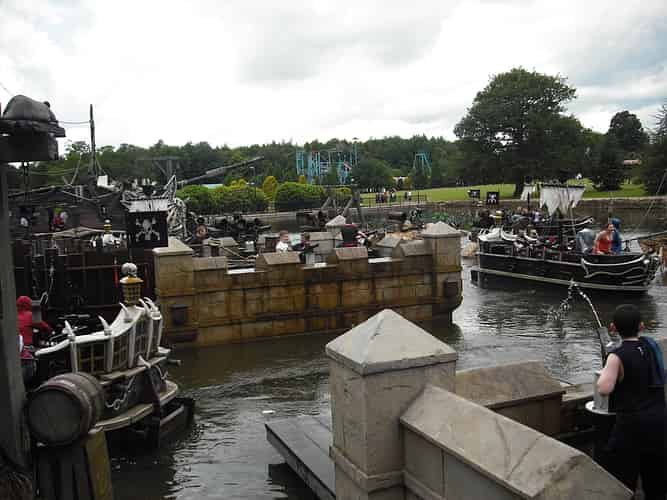Scattered around the ride are forts where guests can crank cannons to shoot water at passing galleons. The streams of water look deceptivley weak, but even a few seconds of being hit will leave you soaked.