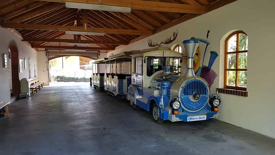 A trackless train runs around the pathways of Bayern Park.