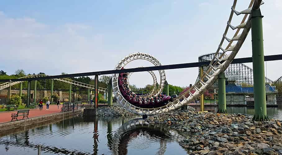 Limit and Big Loop, with La Ola on the right. The building on the lake was previously used as the dock for a rail guided paddle-steamer ride.