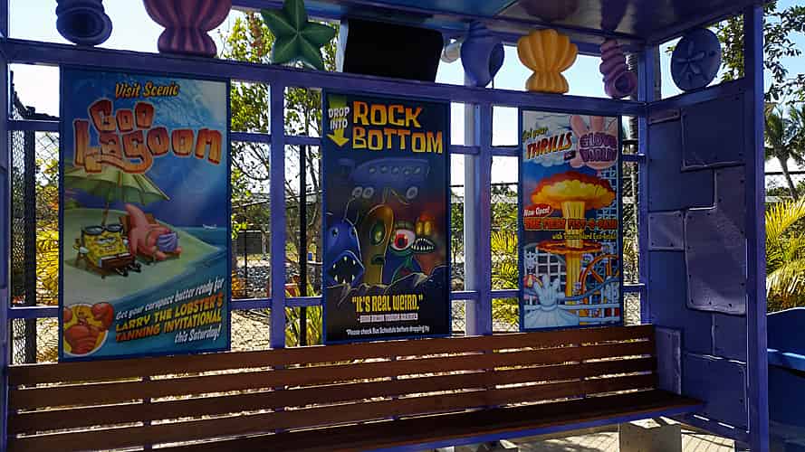 Posters adorn a bus shelter for such exciting Bikini Bottom destinations as Glove World.