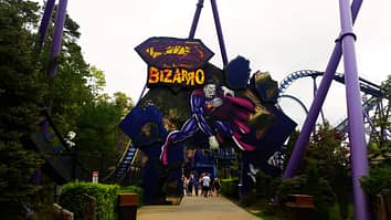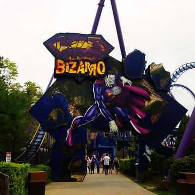Bizzaro is a B&M Floorless coaster themed around the alternate world inhabiting, anti-hero, opposite/negative counterpart of Superman.