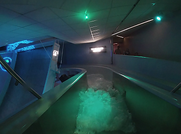 Most of the ride is in the darkness, with the odd bit of theming illuminated with UV.