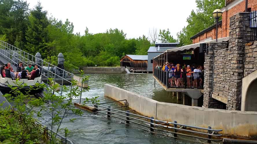 From the top of the lift its down the river, with most of the ride hidden from the rest of the park.