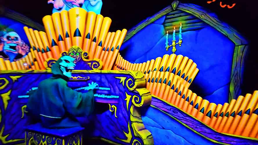 The scenes are a mixture of 2D cutouts and some 3D props, all painted in UV reflective paint.