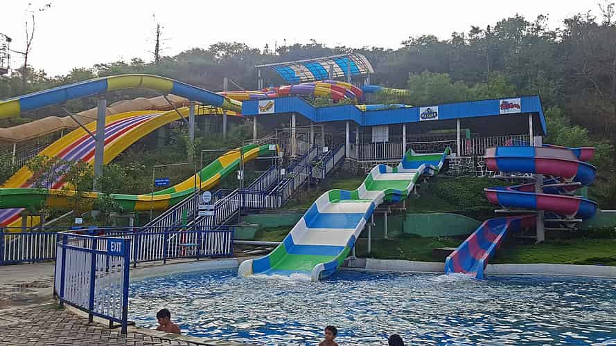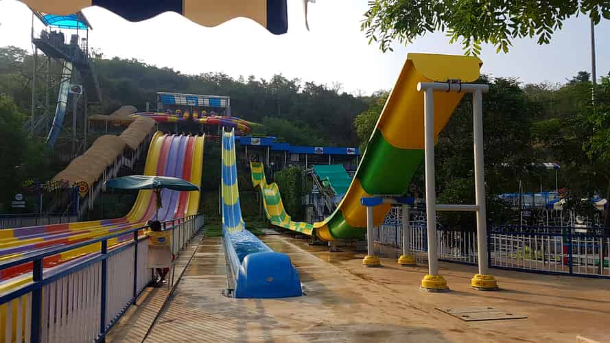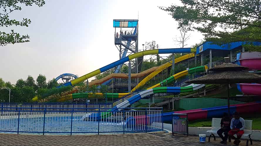 Half the slides at Imagica Water Park start at the top of a hillside and run down to the main central terrace level. From front to back in this shot is Soakerz, Splash, Boomeranggo (sic), Yell-O!, Zip Zap Zoom, and Loopy Woopy.