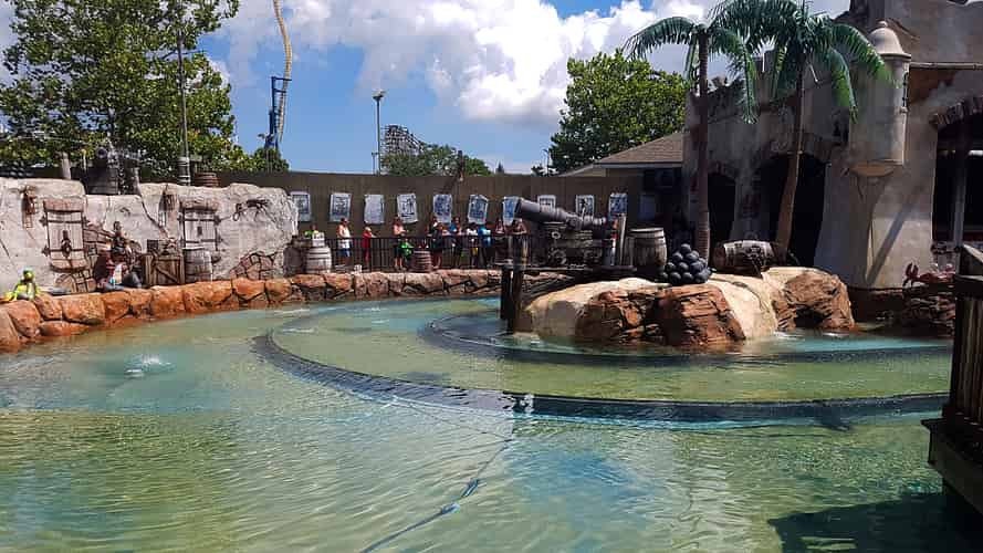 Buccaner Battle takes guests around a course in boats equipped with water guns.