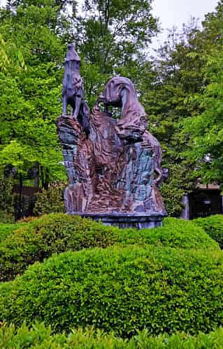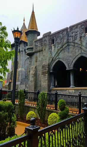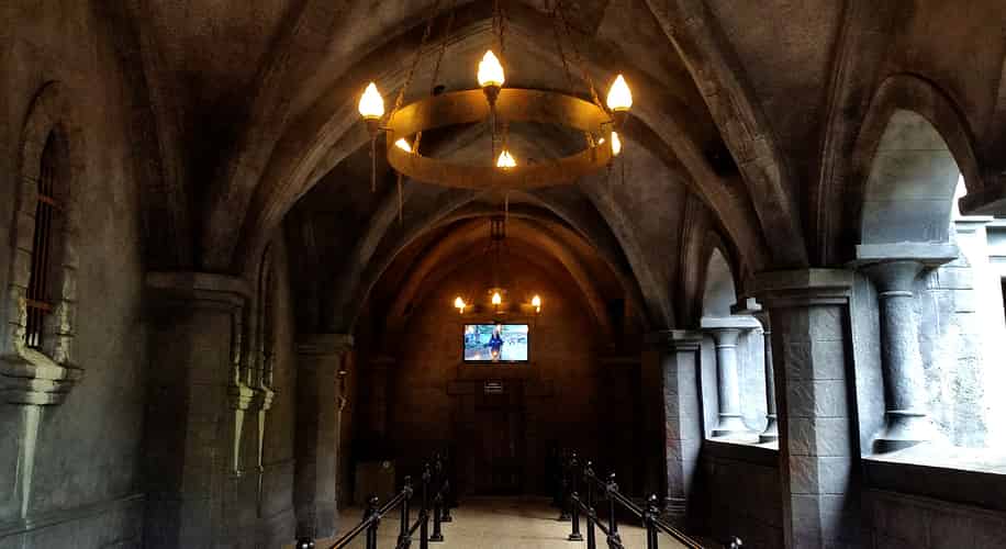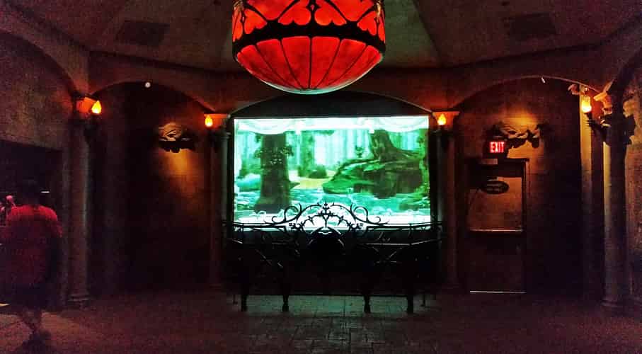The outdoor portion of the queue winds through a landscaped courtyard with some frozen wolf statues as the centerpiece; a hint at the supernatural abilities of Prince Ludwig.