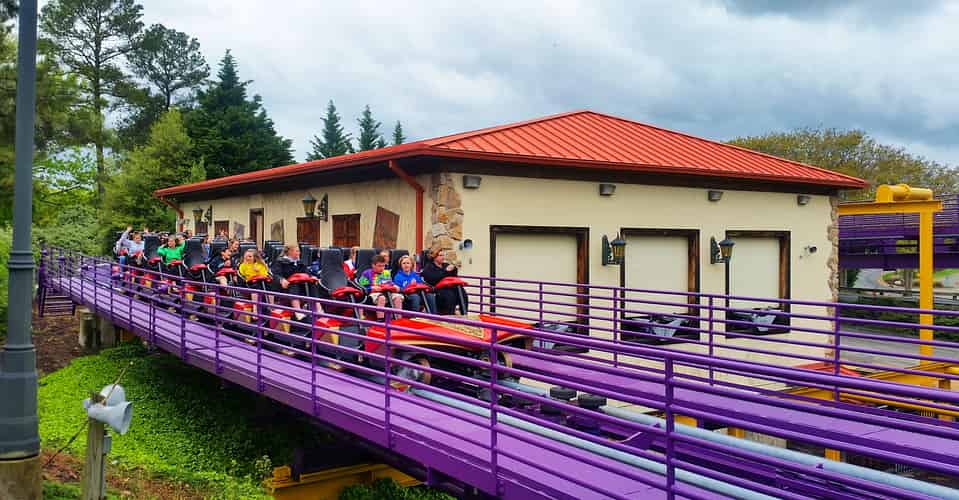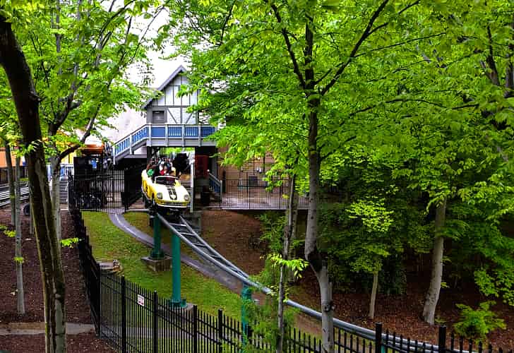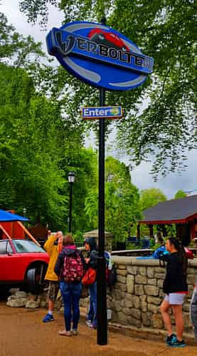 Verbolten is a family thrill coaster themed to driving German sports cars on a winding road through the black forest.