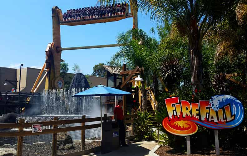 FireFall holds a swinging gondola between two arms, flips riders, and occasionally dunks them into the line of fountains.