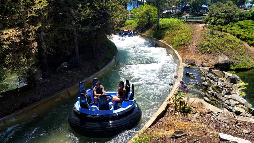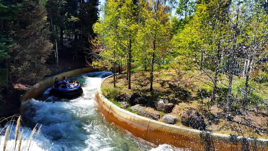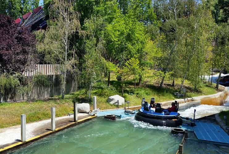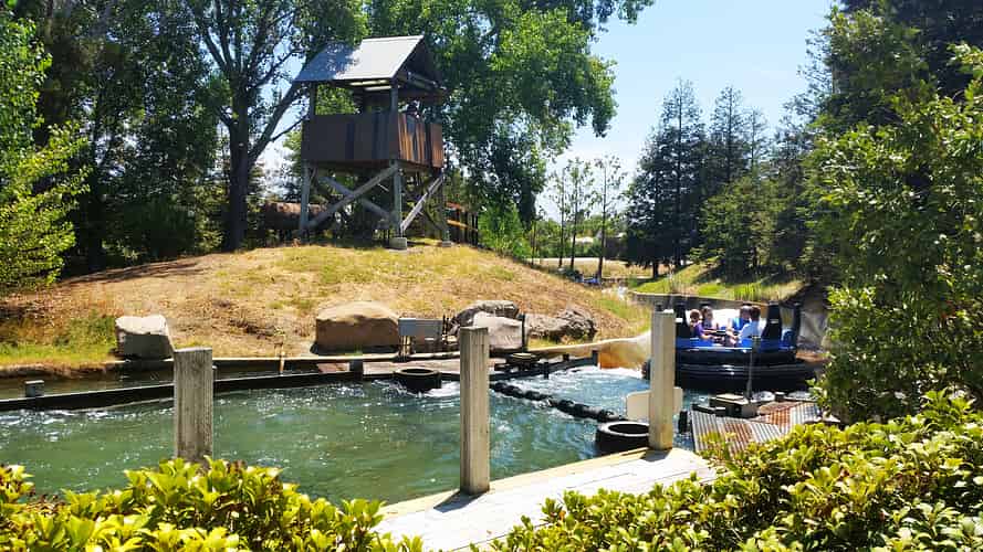 Rip Roaring Rapids takes guests on a rafting expedition through a wooded setting.