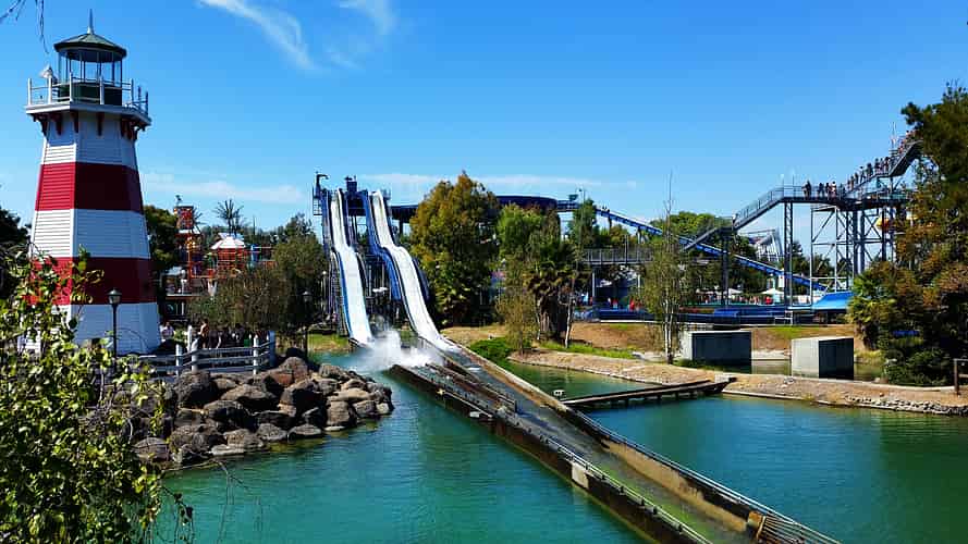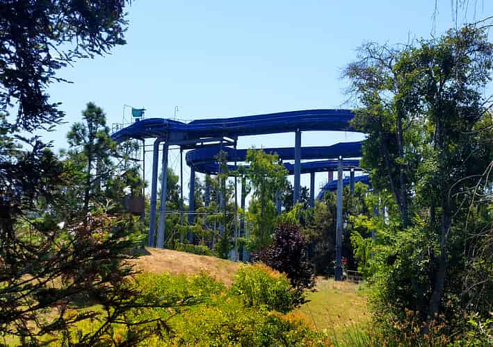 Screamin' Wombat is the spiralling slide on the left, whilst Ripsnort Ridge on the right drops you straight down.