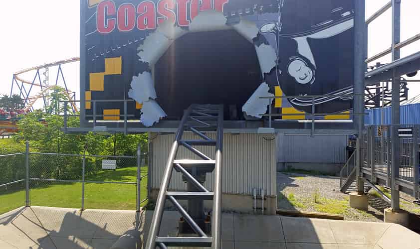 At the end of the ride guests burst out of a tunnel through a billboard.