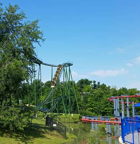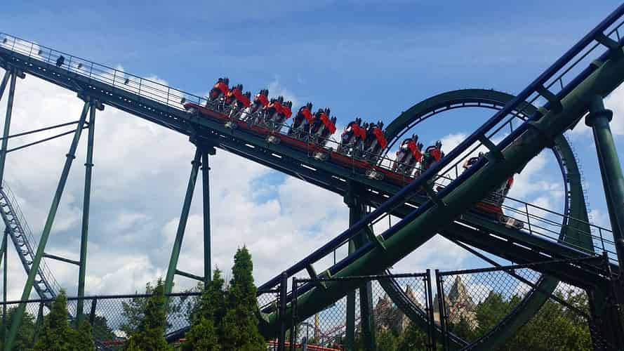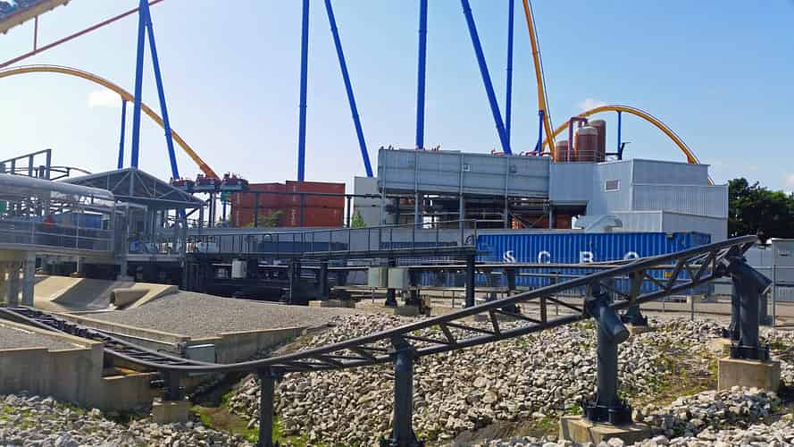 The ride features two launches. The first sends riders straight into an upwards spiral.
