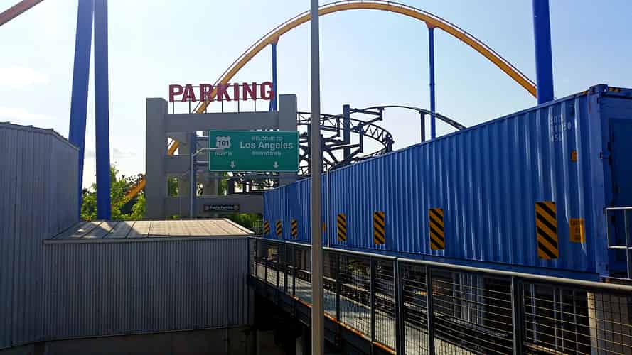 Backlot Stunt Coaster takes guests on a trip through some stereotypical action movie scenes.