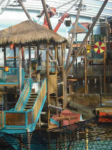 Whenever the giant bucket tips the excess water spills into the main swimming lagoon.