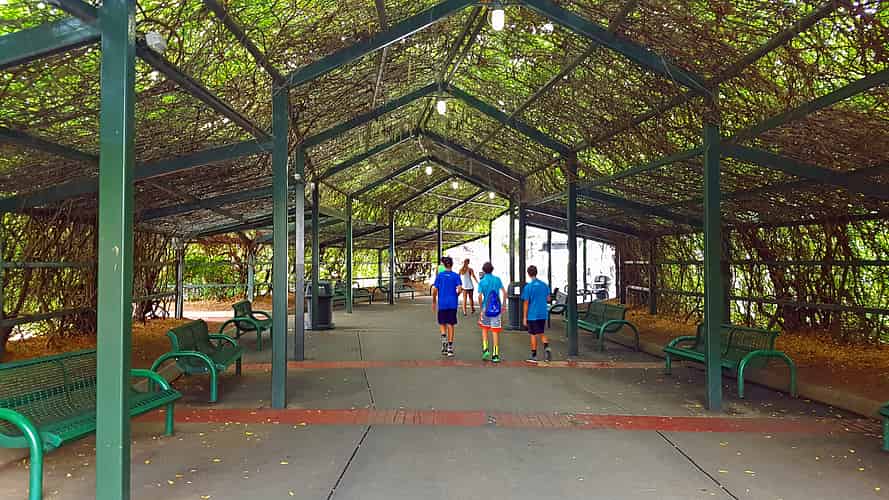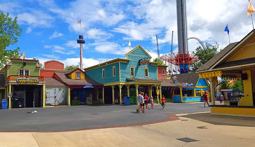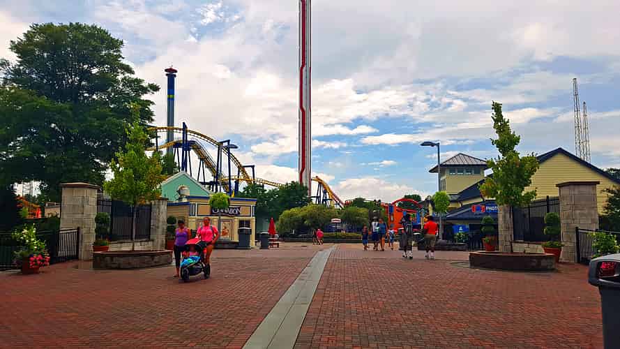 Once you are inside the park you walk down Carowinds Plaza, with the NC/SC state border down the middle.