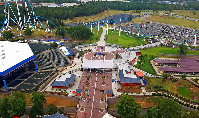 The eastern side of the park, featuring Carolina Cobra, Carolina Goldrusher and Whitewater Falls. Carolina Harbor is beyond.