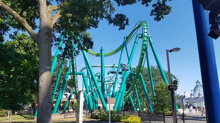 The ride features a sprawling layout with large drop, six inversions and several helices.