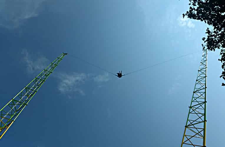 Slingshot launches two riders upwards in a ball, attached to spring loaded cables.