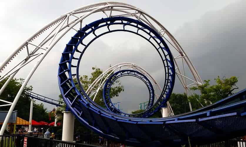 After the first drop you cross a long trestle over the creek, before an upwards helix and a second lift hill.