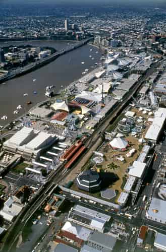 World Expo Park occupied what is now the Brisbane Convention & Exhibition Centre. The Titan roller coaster sits in the eastern (top) corner, Centrifuge in the middle and the indoor coaster Supernova in the large black building at western end of the park.