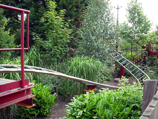 What's untypical is that the whole ride has been sunk into the ground, with extensive landscaping and theming.